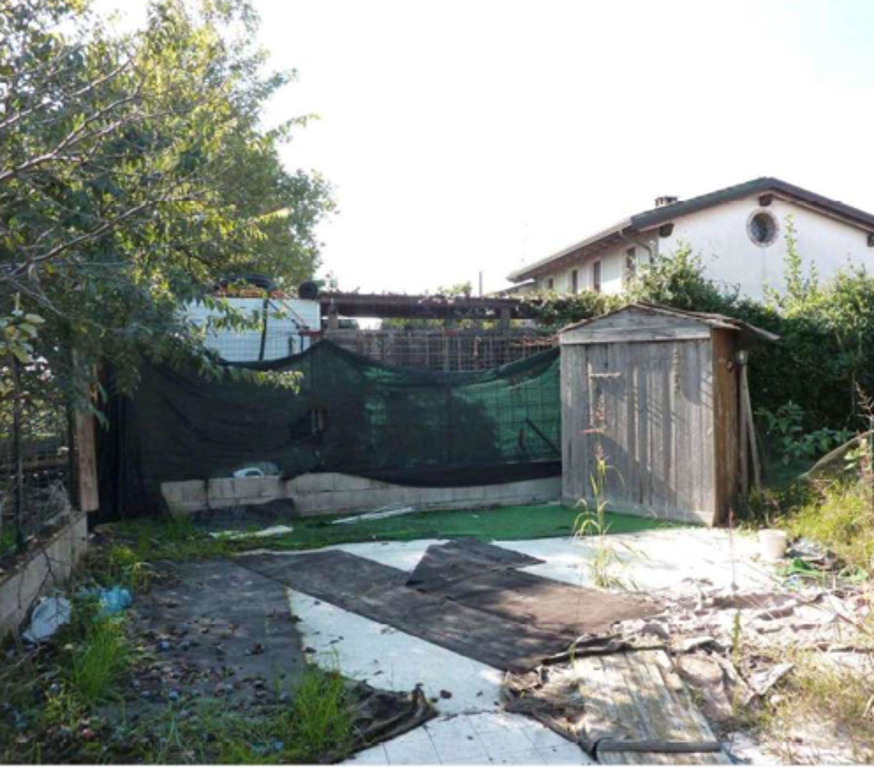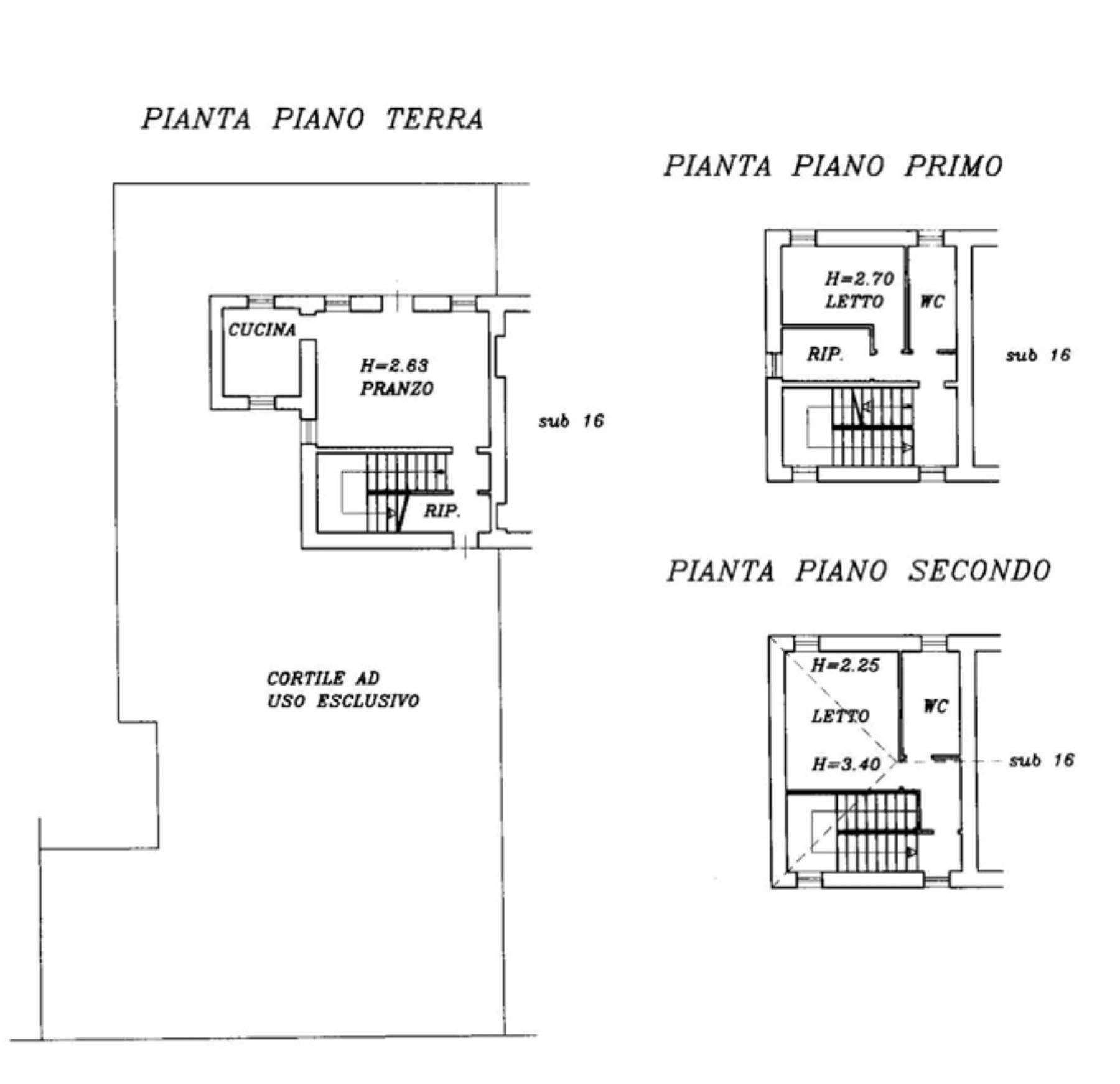 Descrizione sintetica: abitazione di tipo casa a schiera disposta su tre livelli (piano terra, primo e secondo) con corte esclusiva pertinenziale. Al piano terra è presente un ingresso su zona pranzo-soggiorno con camino, collegata a cucina separata e locali accessori (disimpegno, ripostiglio sottoscala e vano scala interno). Al piano primo si sviluppa la zona notte composta da disimpegno, bagno finestrato e una camera da letto con ulteriore ripostiglio. Al piano secondo è presente un ulteriore livello mansardato con camera da letto, bagno e vano accessorio/ripostiglio. Completa la proprietà una corte esterna esclusiva su tre lati con porticato in legno e area a giardino/parzialmente pavimentata di mq 64,00.