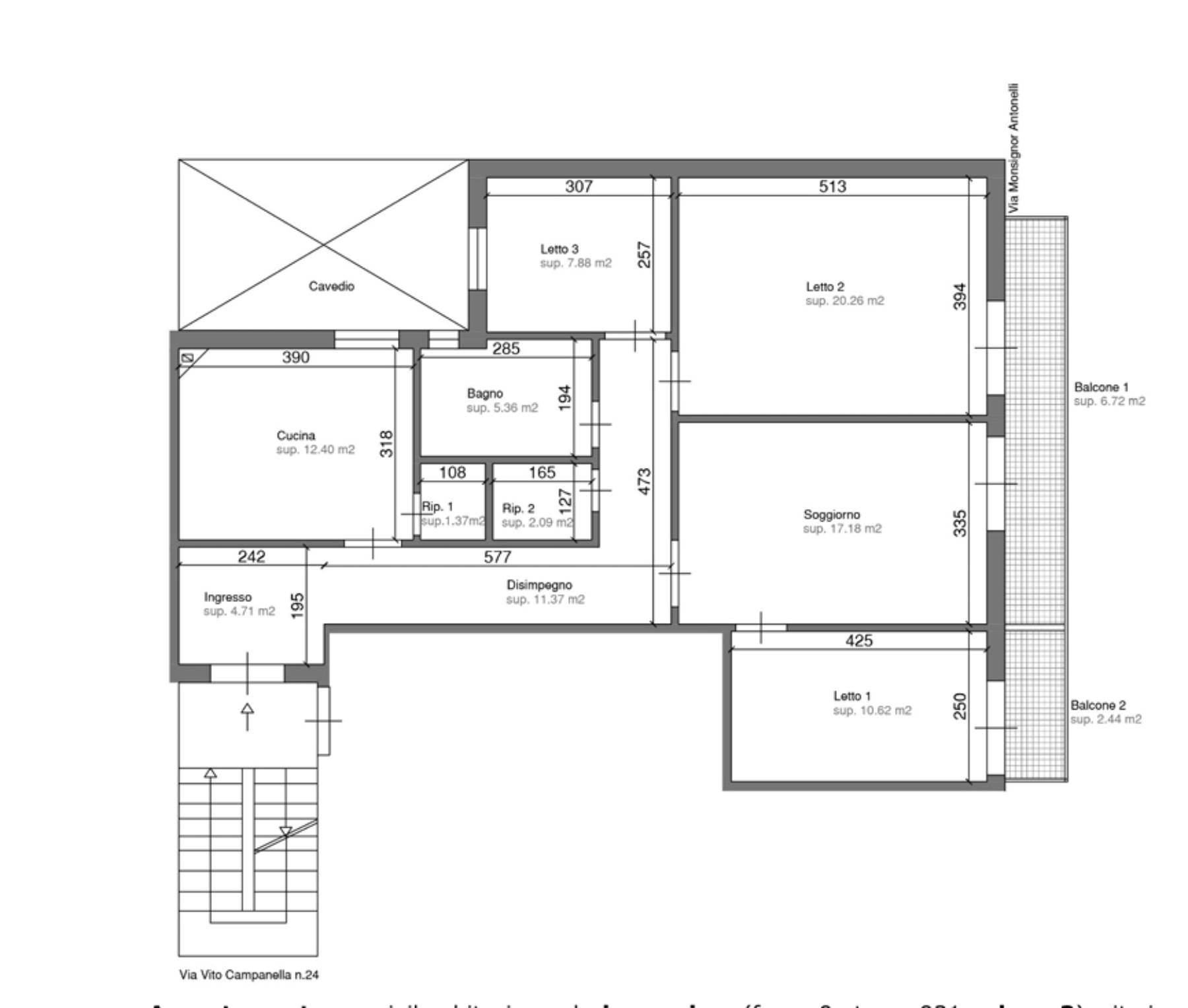 Descrizione sintetica: Abitazione posta al piano primo e composta dal vano ingresso, dal soggiorno, dalla cucina, dal disimpegno, da due ripostigli, da tre camere da letto e dal bagno, oltre a due balconi di mq 9,78. Locale cantina/deposito al piano terra di mq 36,82.