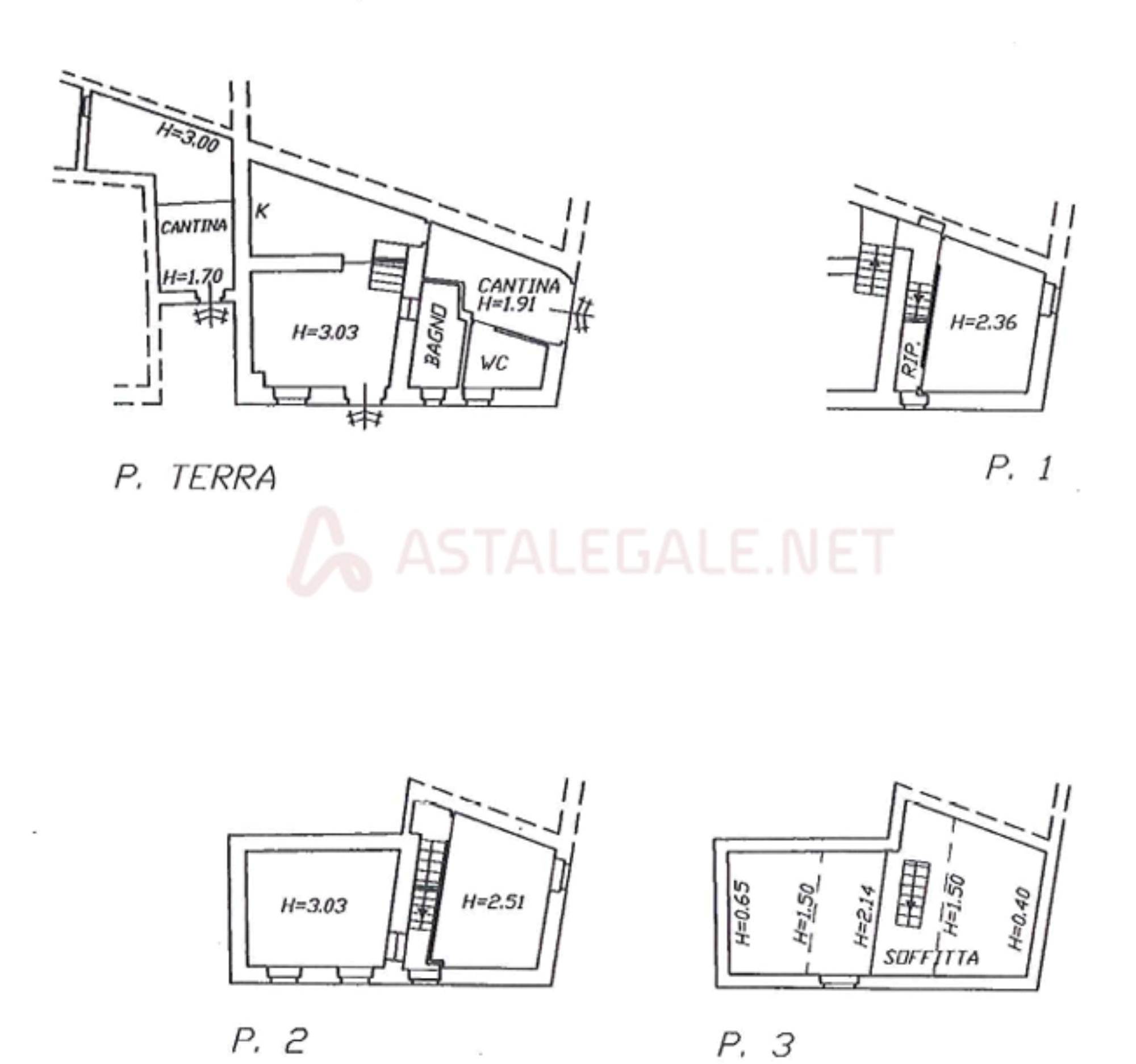 Abitazione di tipo civile dislocata su quattro piani fuori terra (Piano terra, primo, secondo e terzo). Al piano terra abbiamo l'ingresso principale ed un ingresso secondario che porta alla cantina-magazzino. Partendo dal piano terra, dove si ha un ingresso-soggiorno con in adiacenza la cucina, abbiamo anche un bagno e con una porta si arriva al locale cantina. con una scala si arriva al piano primo, dove abbiamo una prima camera da letto, con altra scala si arriva al piano secondo, dove abbiamo ancora due camere, sopra a queste due camere abbiamo una soffitta per un totale di superficie accessori di mq 59,00.