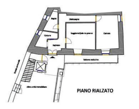 Descrizione sintetica: Appartamento posto al piano rialzato composto da ingresso, soggiorno, piccolo locale cottura, disimpegno, bagno e camera. Presenza di balcone esclusivo di 10,03 mq. Al piano seminterrato presenti locali accessori ad uso cantina e deposito. Cortile/giardino esclusivo.