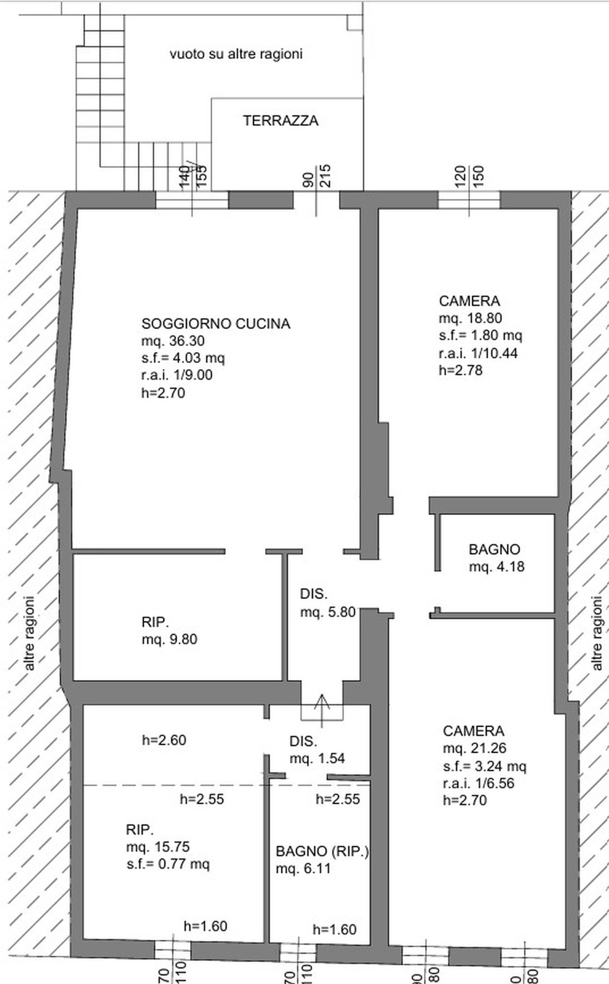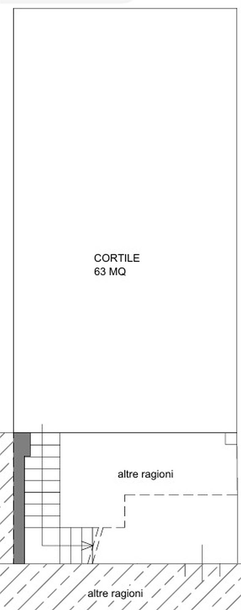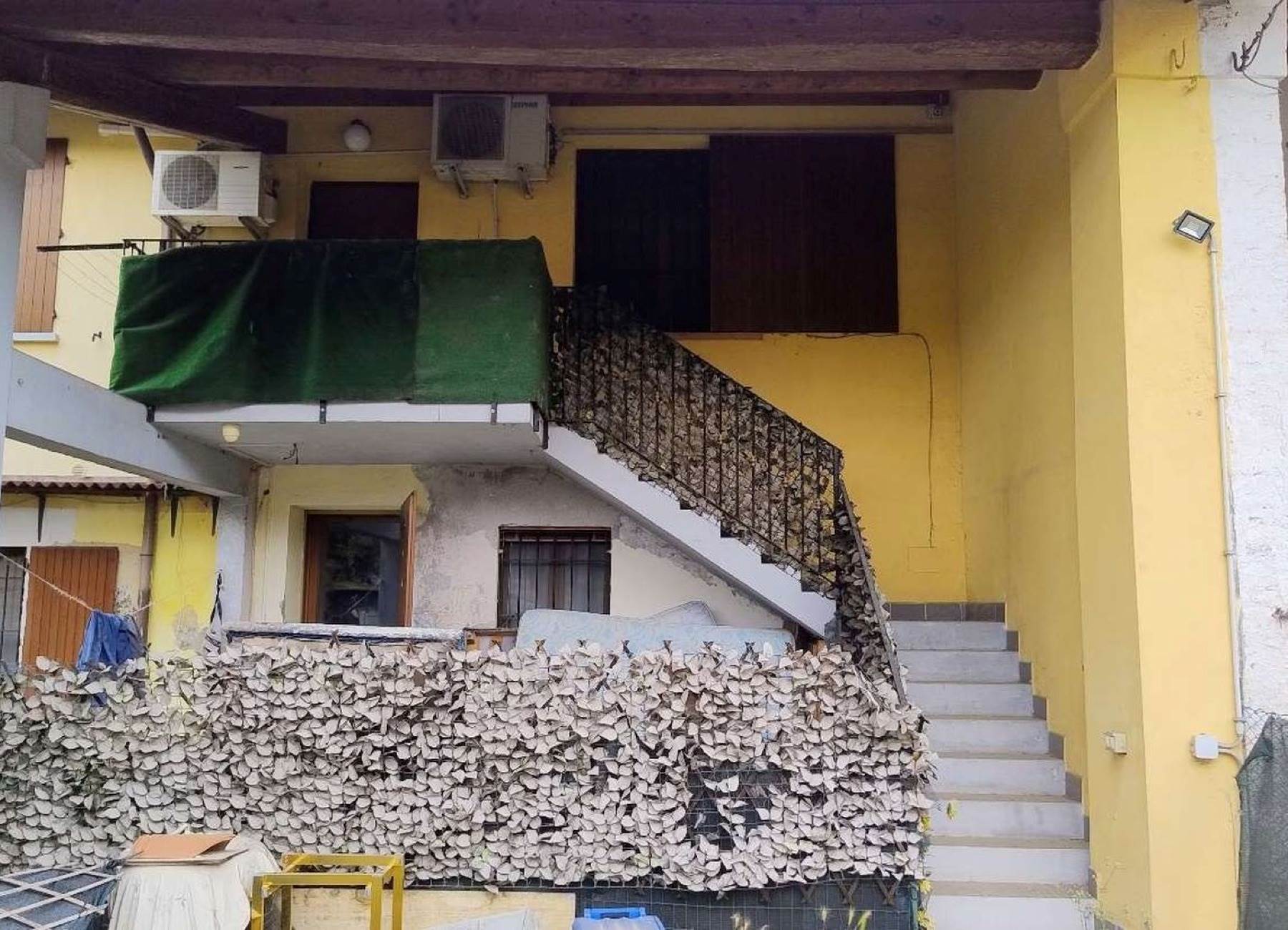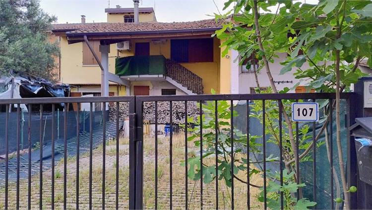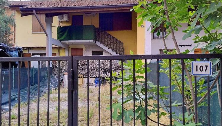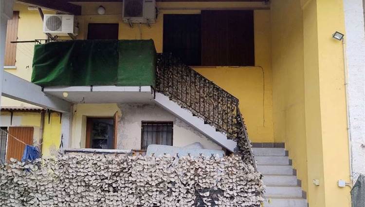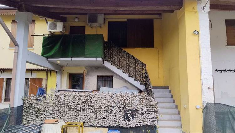 Descrizione sintetica: appartamento di 145 mq al piano primo composto da vano scala con terrazza d’accesso, cucina, tre disimpegni, due camere, due bagni, dispensa e ripostiglio, con annessa porzione di area adibita a giardino al piano terra in lato sud.