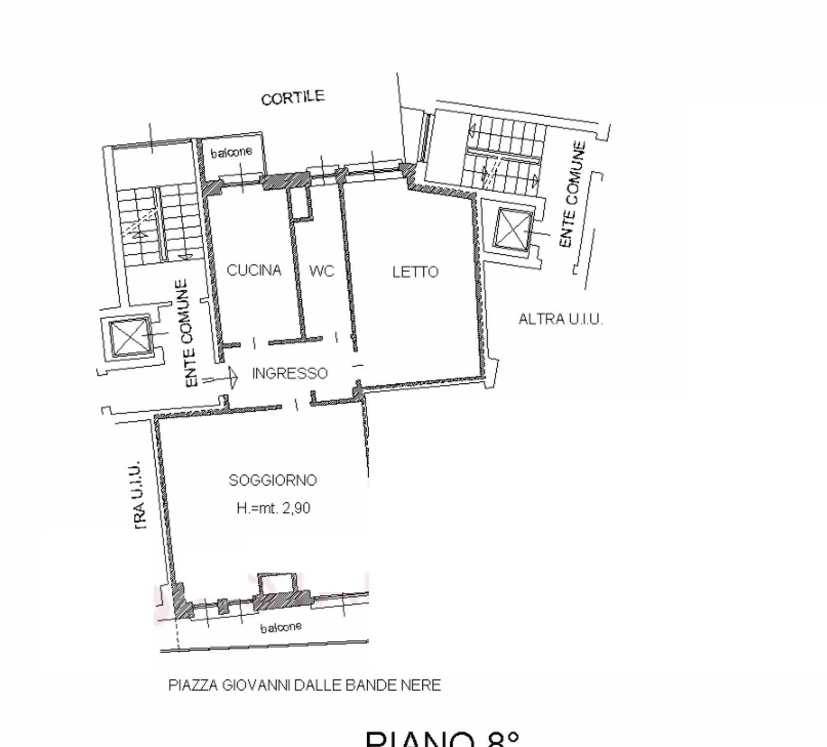 Descrizione sintetica: Appartamento al piano ottavo composto da soggiorno, cucina, una camera da letto e bagno oltre due balconi di 7,64 mq e vano solaio al piano sottotetto di 2,92 mq.
