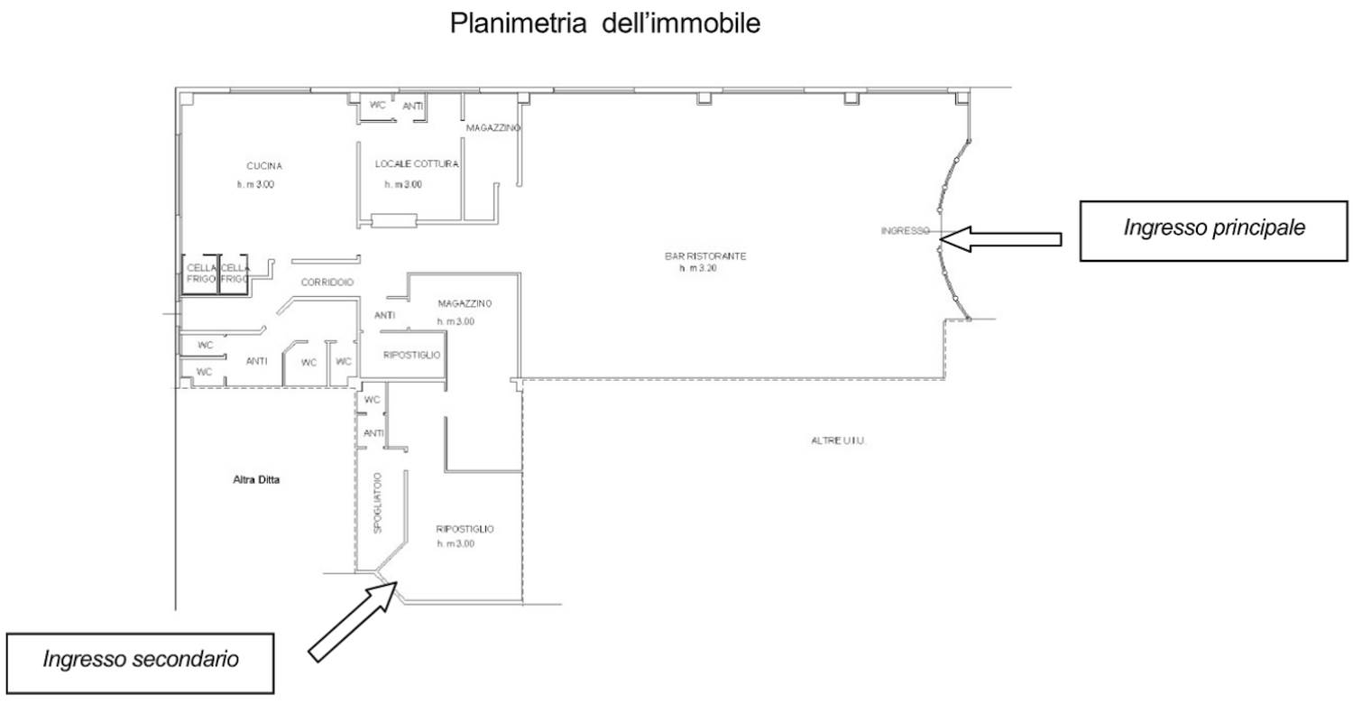 Descrizione sintetica: Piena proprietà di porzione di fabbricato a uso commerciale costituita da unità immobiliare al p.primo composta da bar ristorante, 2 magazzini, 2 ripostigli, locale cottura, spogliatoio, 4 anti, 6 wc, corridoio, cucina, 2 celle frigo. Mq. 502,00.