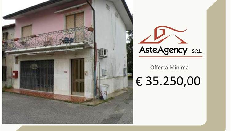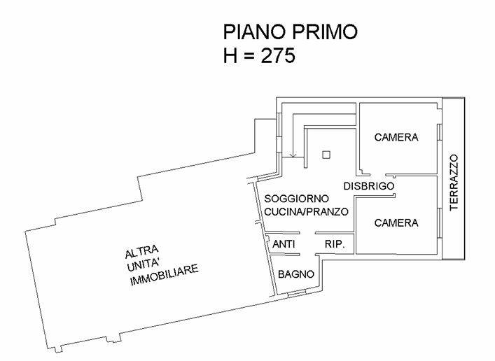 Descrizione sintetica: Appartamento al piano primo composto da soggiorno con angolo cottura, due camere, bagno, ripostiglio e balcone di mq 9,00, con autorimessa in corpo staccato di mq 19,00. Cantina di mq 19,00.