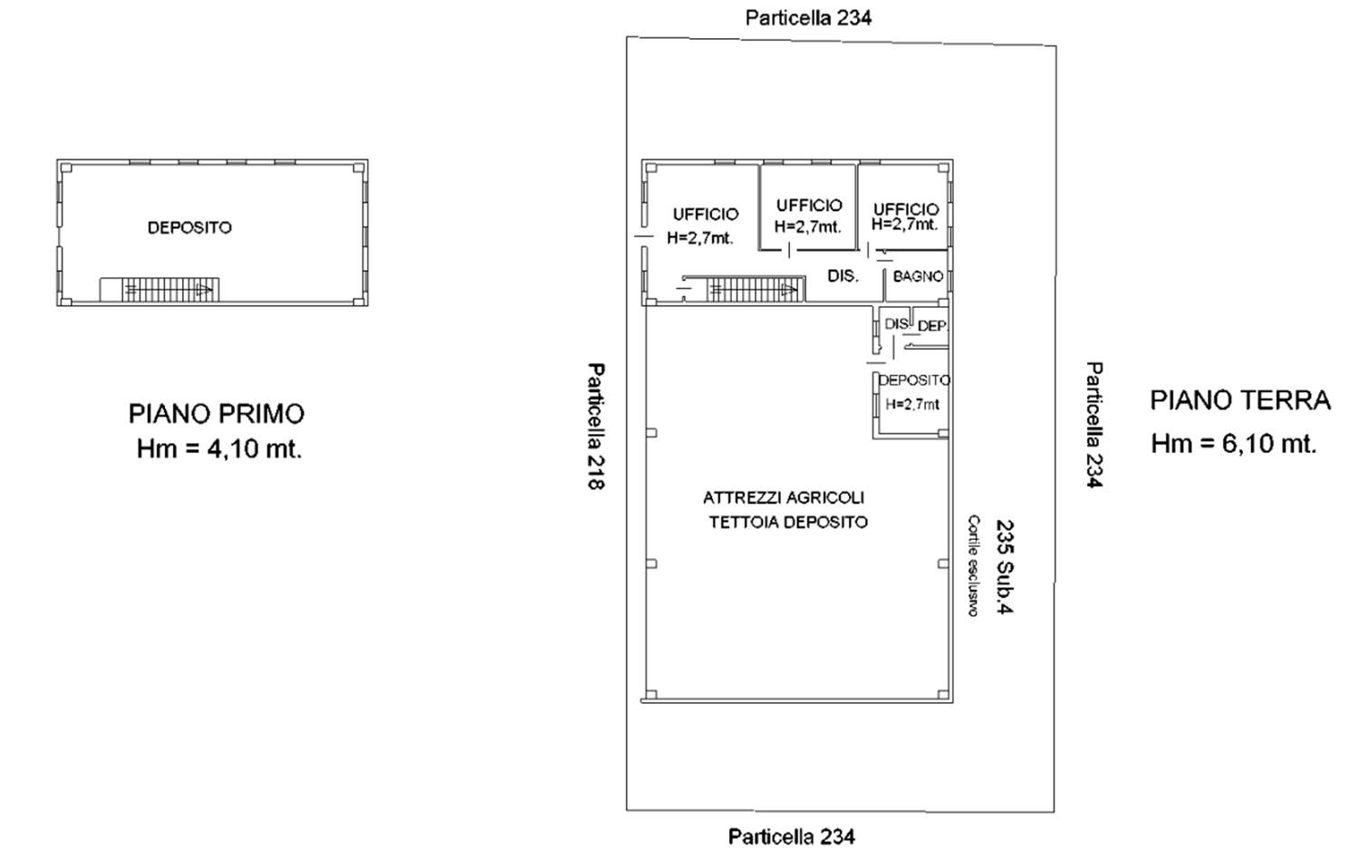 Gli uffici, situati al piano terra e al piano primo, hanno una superficie di 110,00 mq l'uno. Il locale deposito misura 25,00 mq, mentre la tettoia si estende per 283,00 mq.