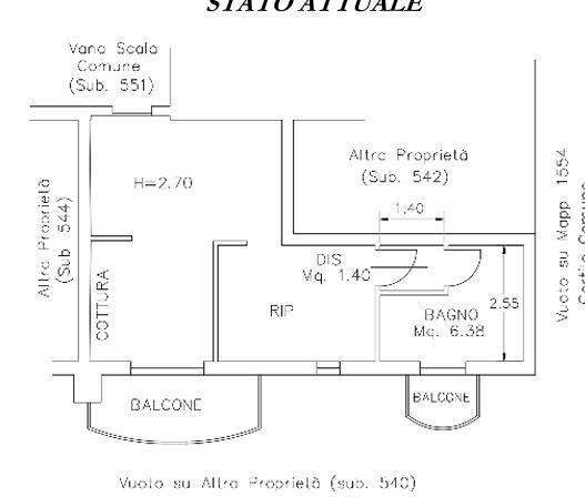 Descrizione sintetica: appartamento posto al secondo piano, composto da Monolocale con zona Cottura, Ripostiglio ad uso Camera da letto, Bagno, Disimpegno e due balconi di mq 6,00, con annessi cantina di mq 4,00 e posto auto scoperto al piano terra di mq 17,00.