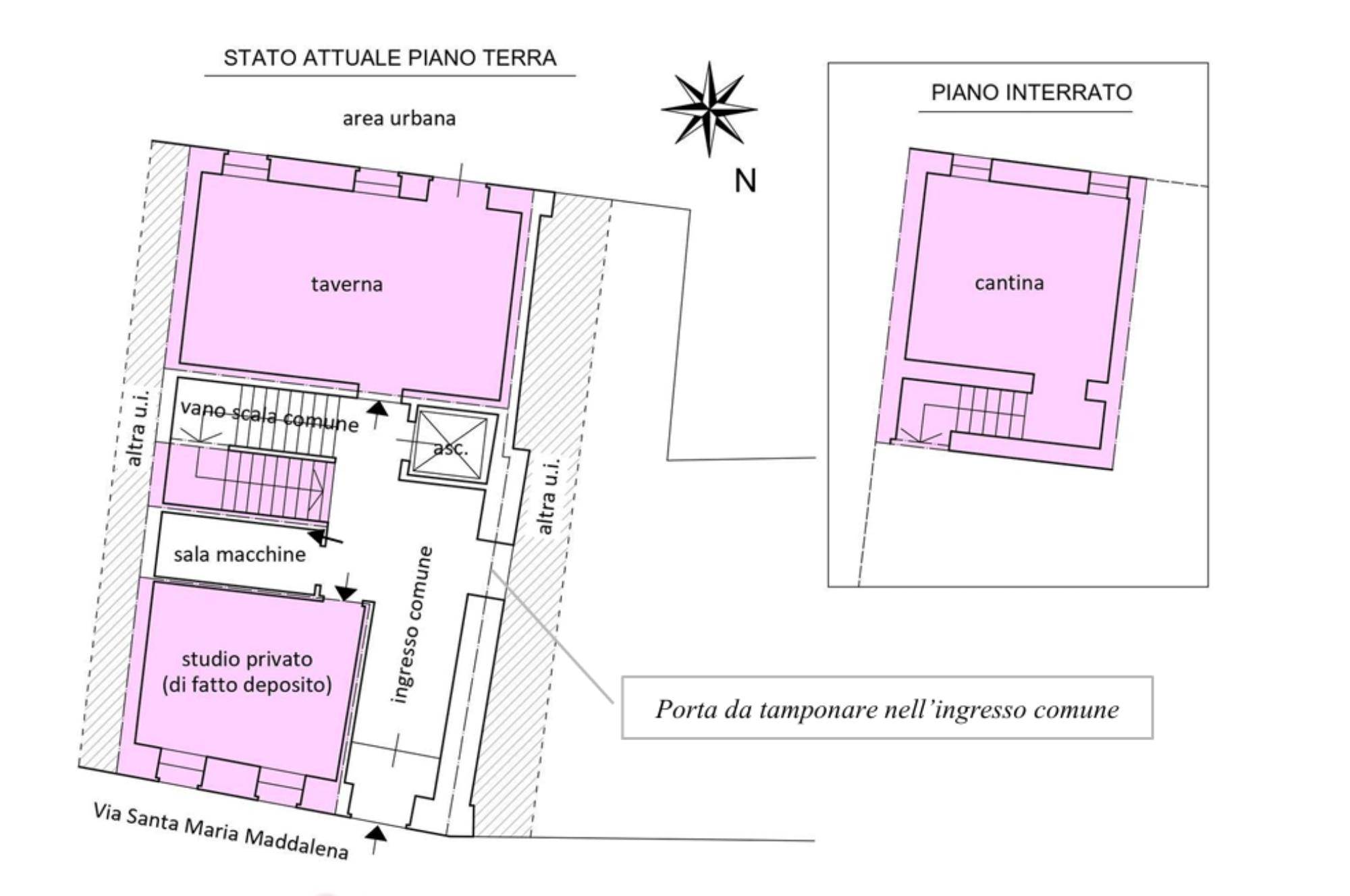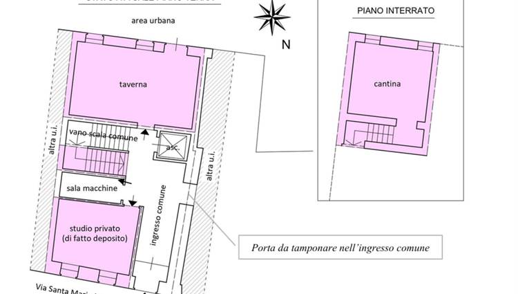 Appartamento di ampie dimensioni al piano primo e di sottostante unità (ai piani terra ed interrato) accatastata con Cat. A/10 (“Uffici e studi privati”) ma, di fatto, consistente in locali accessori complementari alla residenza, il tutto all’interno di una palazzina sita in centro storico. L'unita abitativa risulta composta da ingresso, cucina-soggiorno, ampio corridoio centrale (utilizzato come salotto), lavanderia con centrale termica, n. 2 camere, disimpegno e n. 2 bagni; come segnalato in perizia, l’unita non è dotata di terrazze. L'unità uso ufficio, nella realtà consiste in n. 3 locali accessori complementari alla residenza (non direttamente comunicanti tra di loro), ossia una piccola stanza di deposito, una taverna dotata di caminetto e zona cottura e una cantina interrata raggiungibile tramite scala interna che si prende dall’ingresso comune per una superficie di mq 37,00.