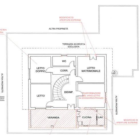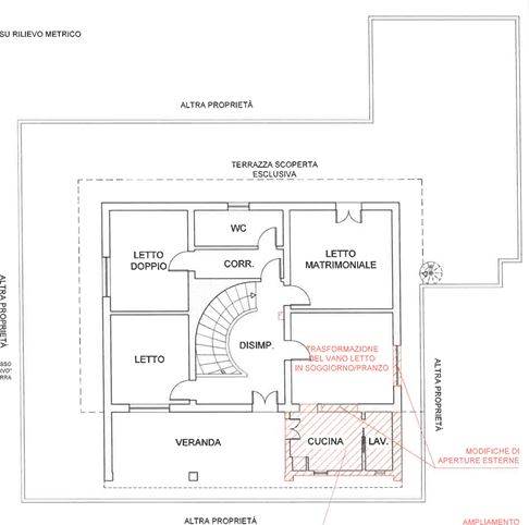 Descrizione sintetica: Appartamento al piano primo, facente parte di un edificio bifamiliare composto da soggiorno, cucina, due camere, bagno, lavanderia e terrazza di mq 222,91.