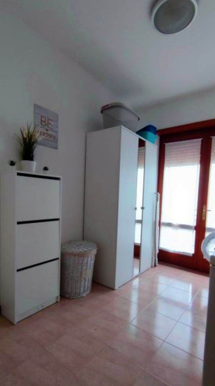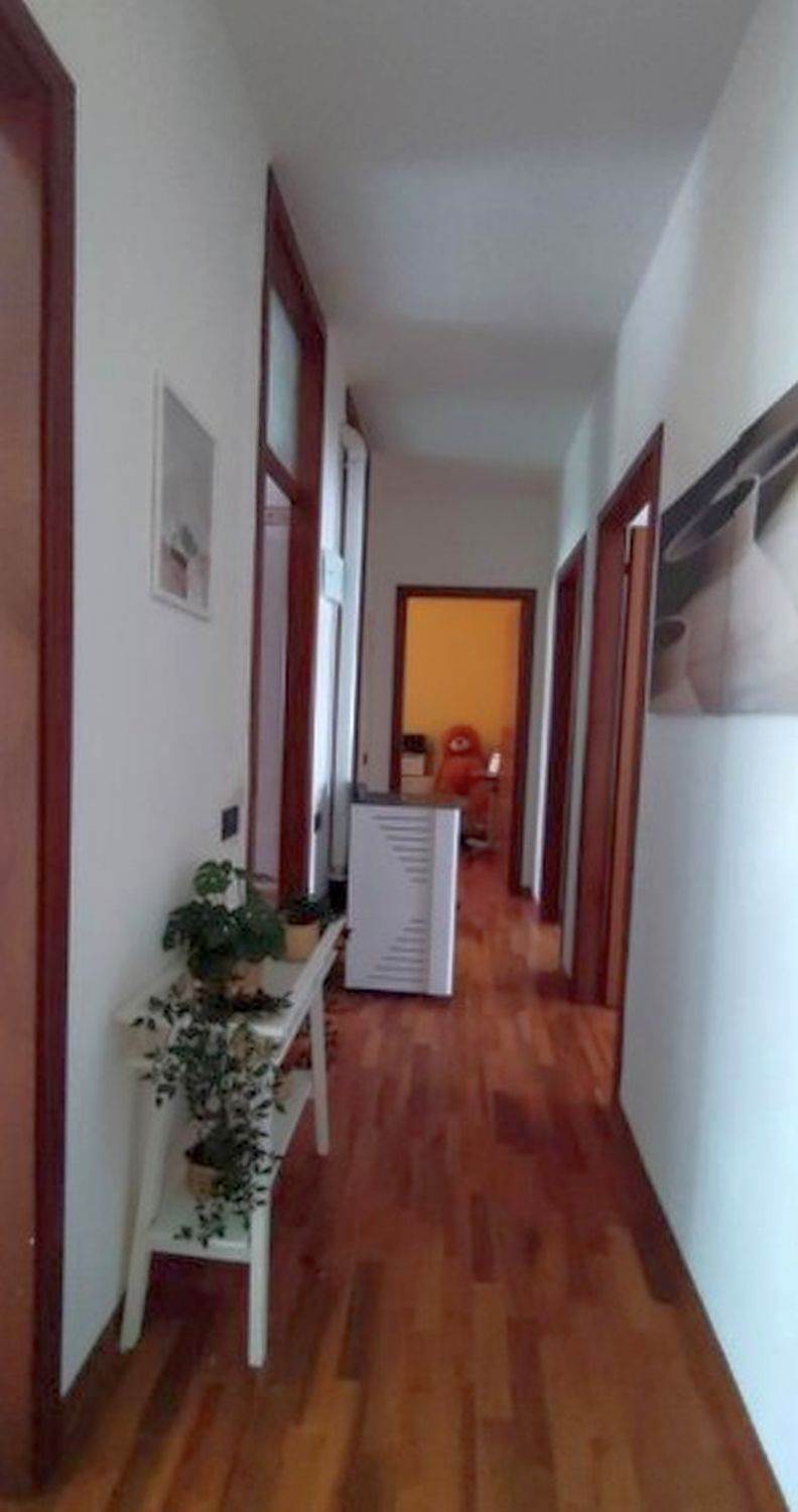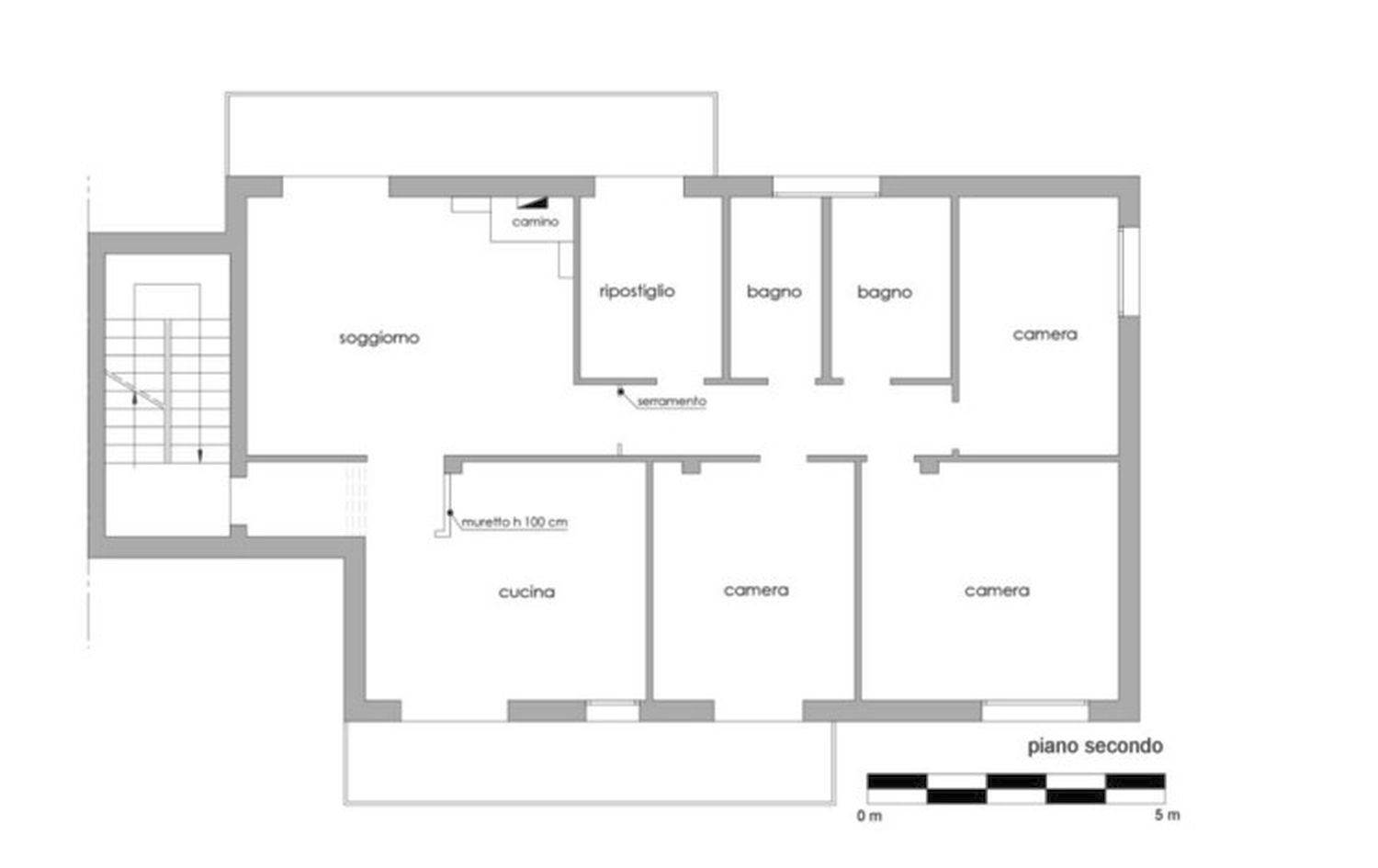 Appartamento al piano secondo composto da disimpegno, ambiente costituito da ampio soggiorno, cucina e sala da pranzo strutturato come open space diviso da pareti interne ma senza porte, corridoio, ripostiglio, due bagni, una camera doppia, due camere singole, due poggioli.