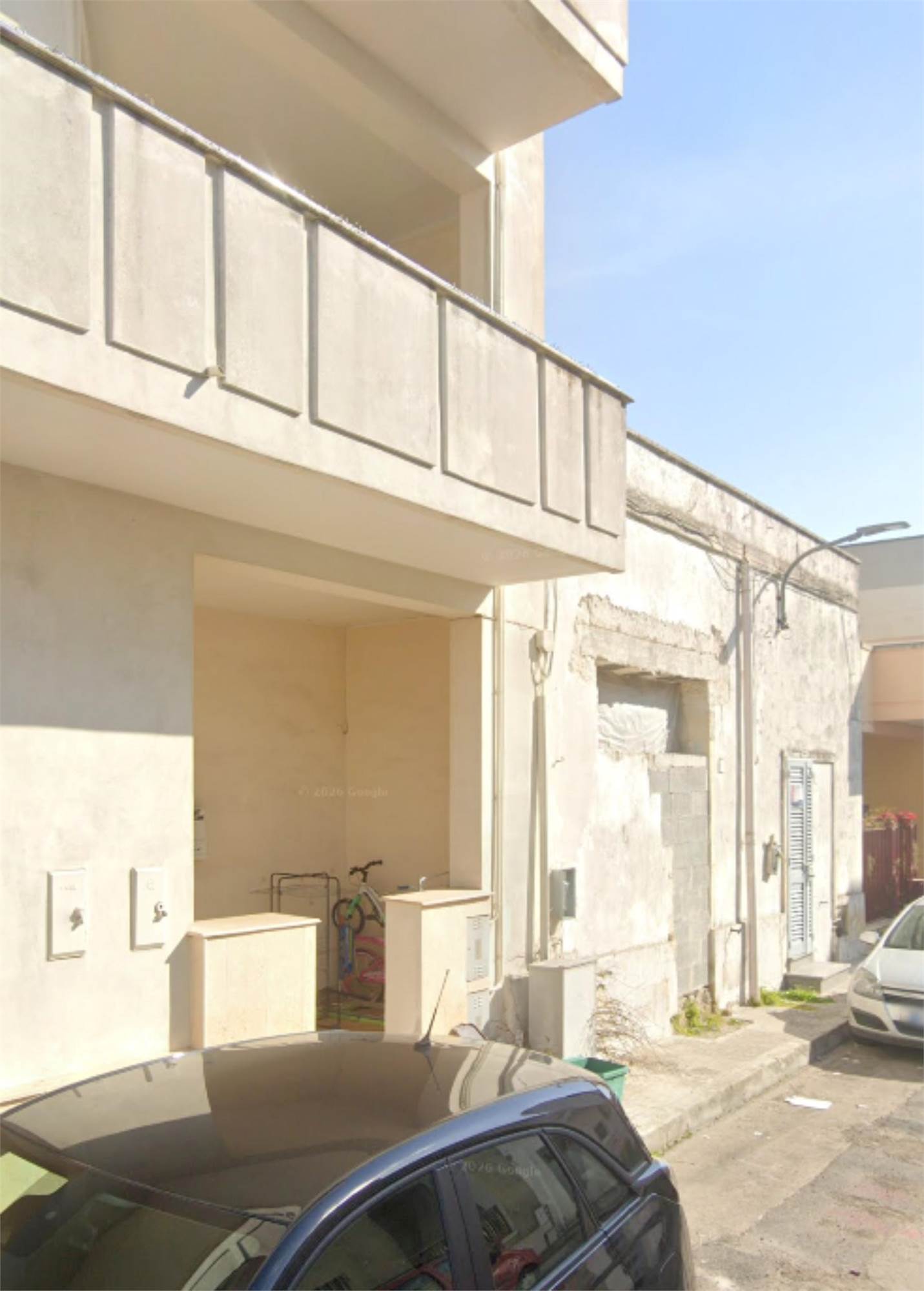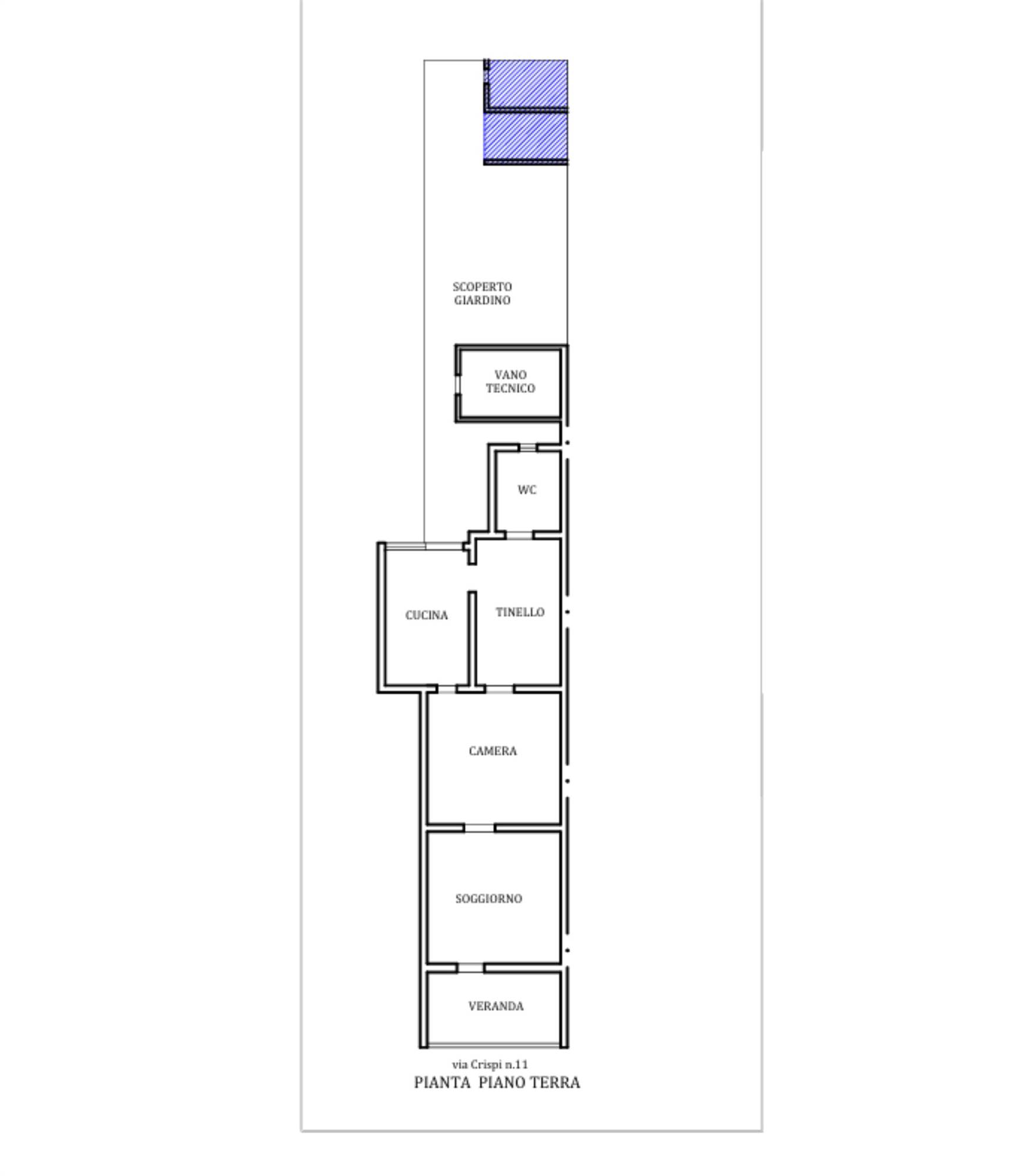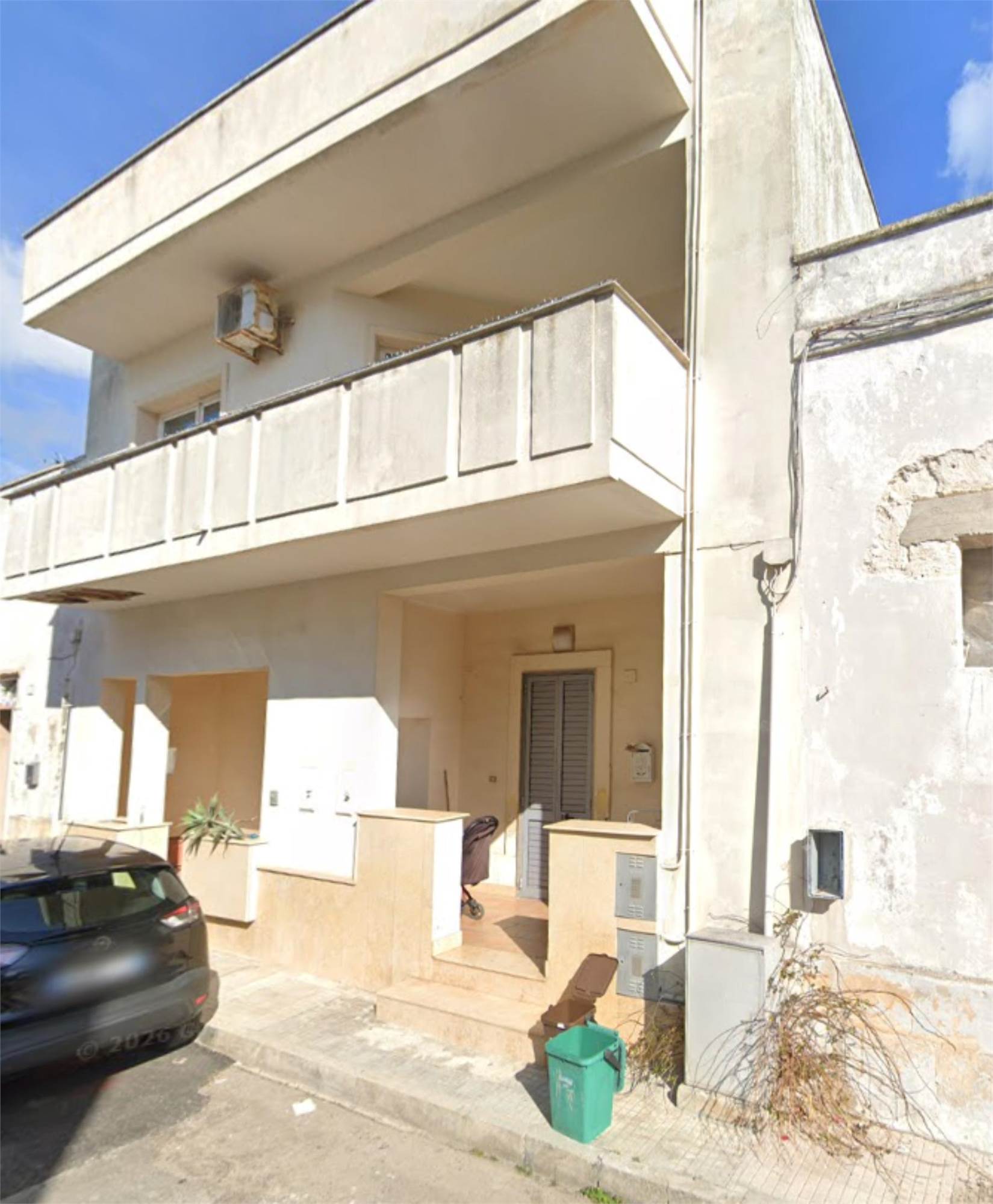 Descrizione sintetica: abitazione disposta ai piani terra e primo, composta al piano terra da veranda antistante su strada, vano ingresso con scala interna, due vani multiuso, WC, ripostiglio e scoperto retrostante di mq 75,00; al primo piano soggiorno-salotto, due camere da letto, cucina, corridoio, ripostiglio, bagno, due terrazze posteriori di mq 24,36 e balcone su strada.