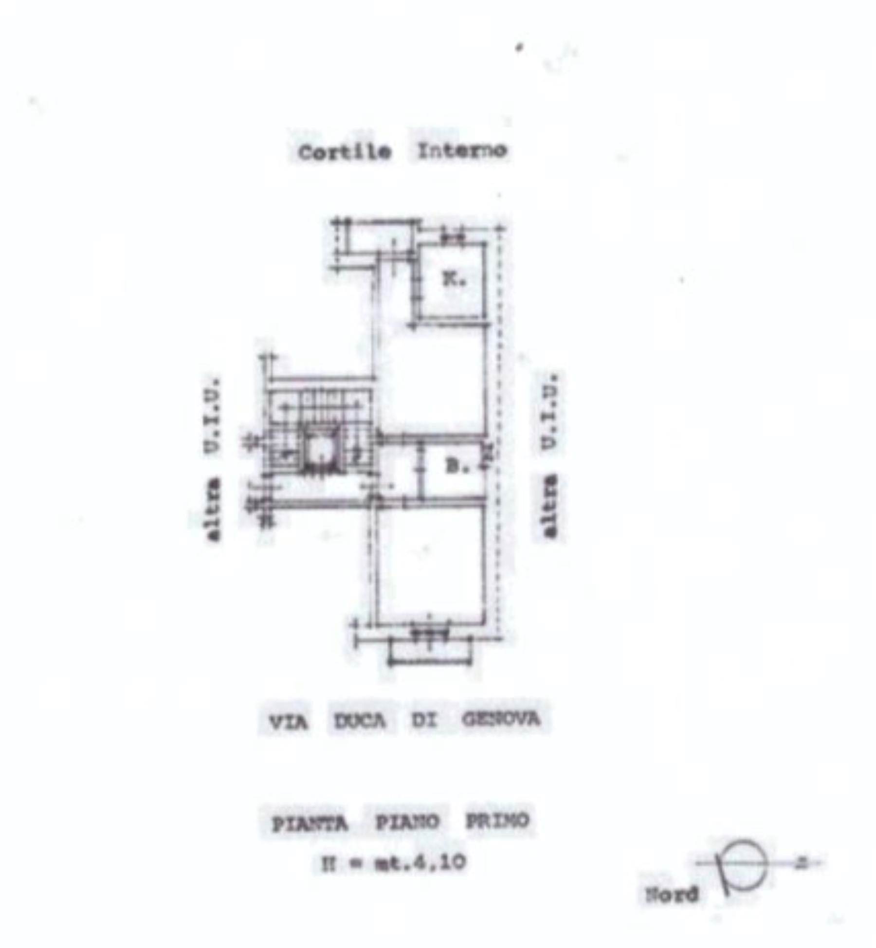 Descrizione sintetica: appartamento posto al piano primo, composto da ingresso/soggiorno, camera da letto matrimoniale con balcone su via Duca di Genova, cucina separata e finestrata, bagno e disimpegno con balcone su corte interna. Totale superficie balconi mq 7,80.