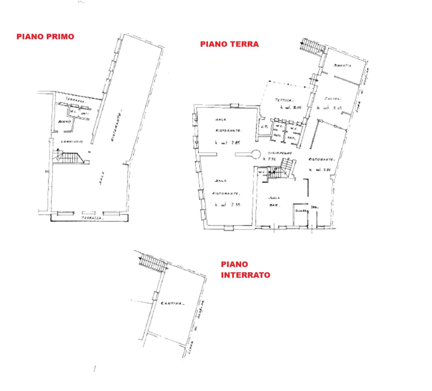 Il ristorante è disposto al piano terra con ingresso, sala ristorante, cucina, dispensa, altre due sale ristorante suddivise da un caminetto, tre w.c. con antibagno e piano interrato con magazzino e cantina.