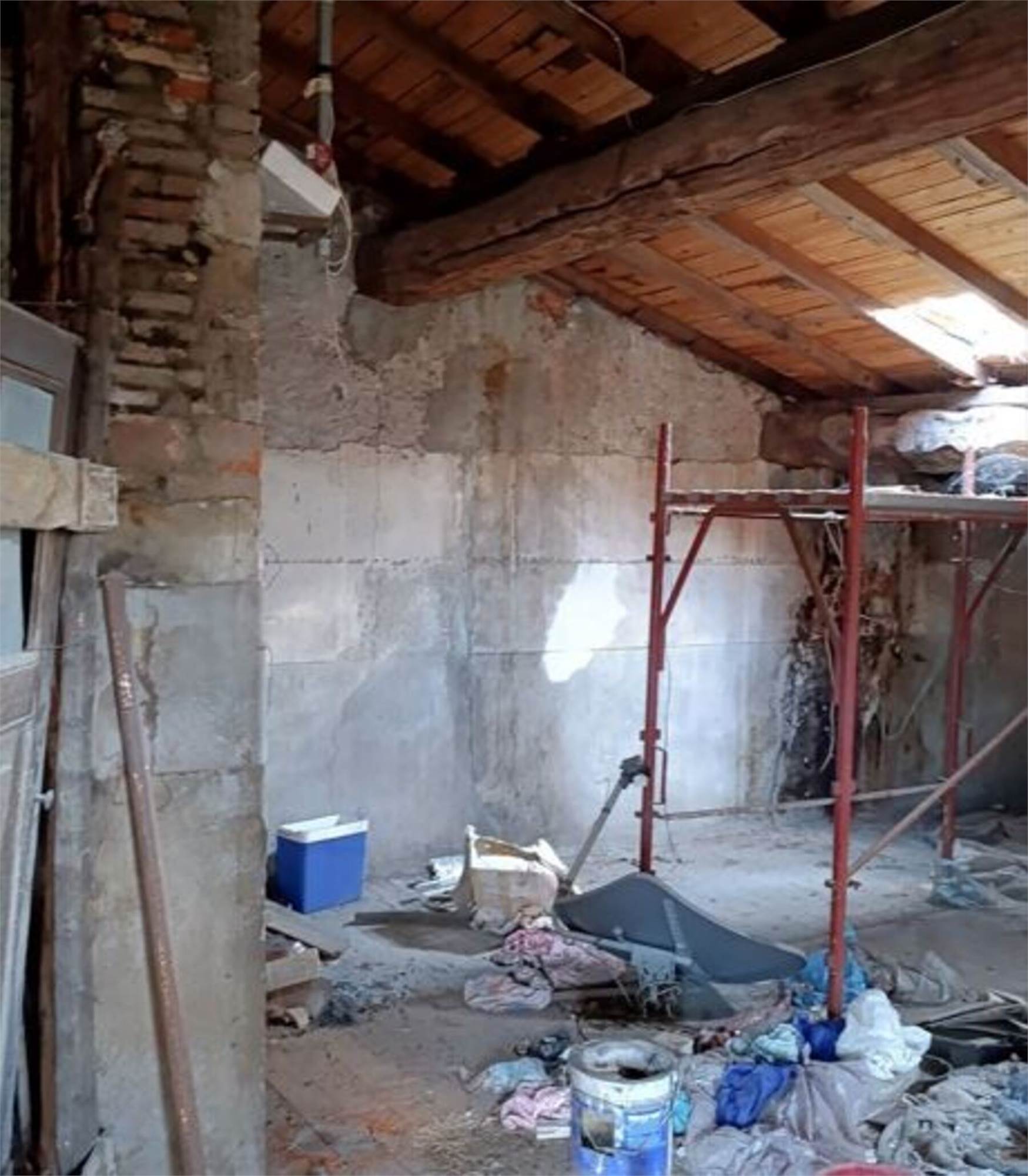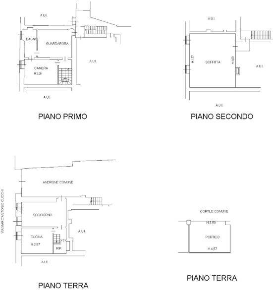 Descrizione sintetica: abitazione unifamiliare, sviluppantesi sui piani terra, primo e secondo, composta di: cucina, soggiorno, disimpegno, ripostiglio e portico di mq 21,00 in separato corpo di fabbrica, al piano terra; camera, guardaroba, bagno e disimpegno, al piano primo; ampia soffitta al piano secondo di mq 48,00.