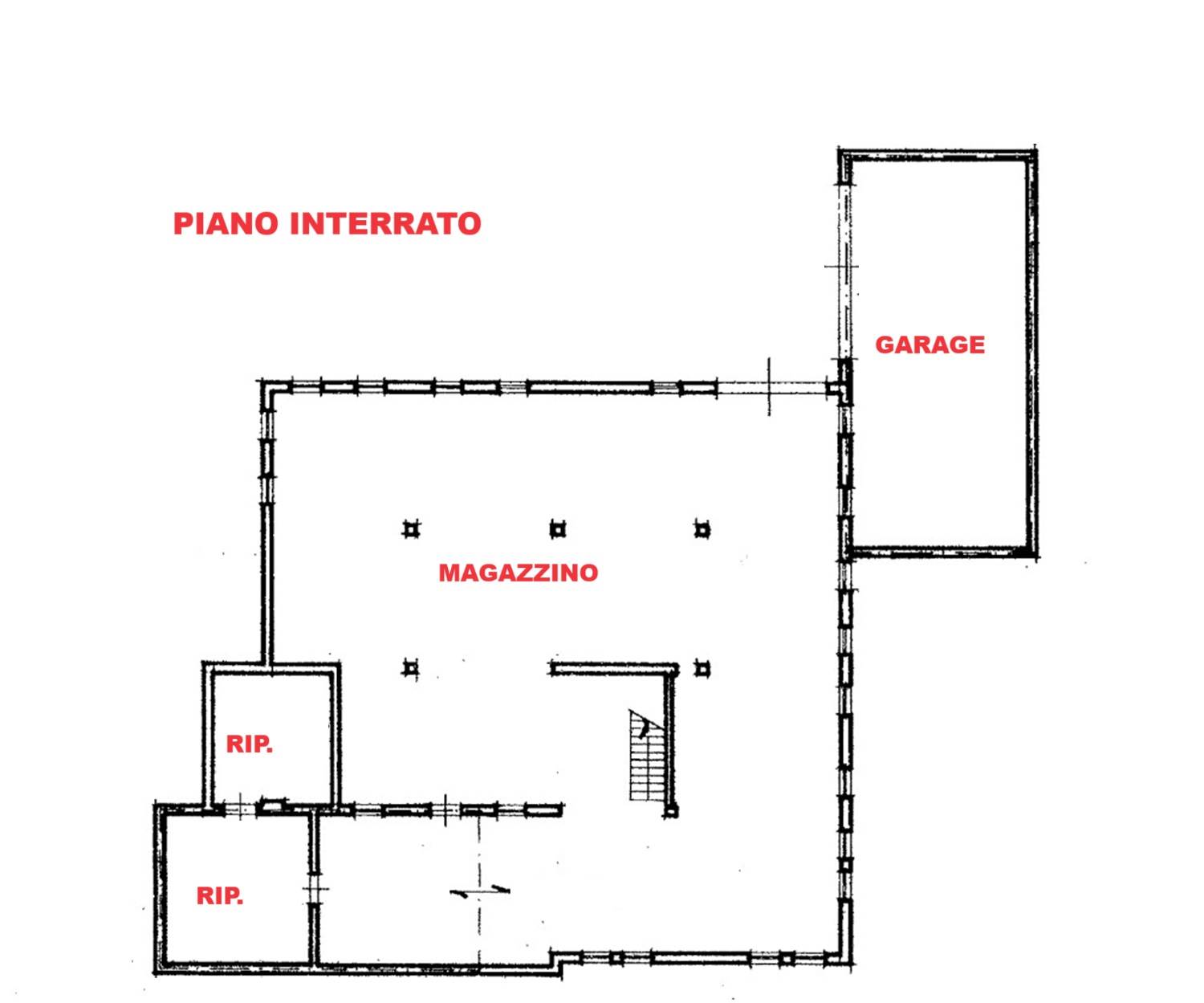 - al piano interrato: magazzino (circa mq. 355), in parte soppalcato, con ripostiglio (circa mq. 86) e