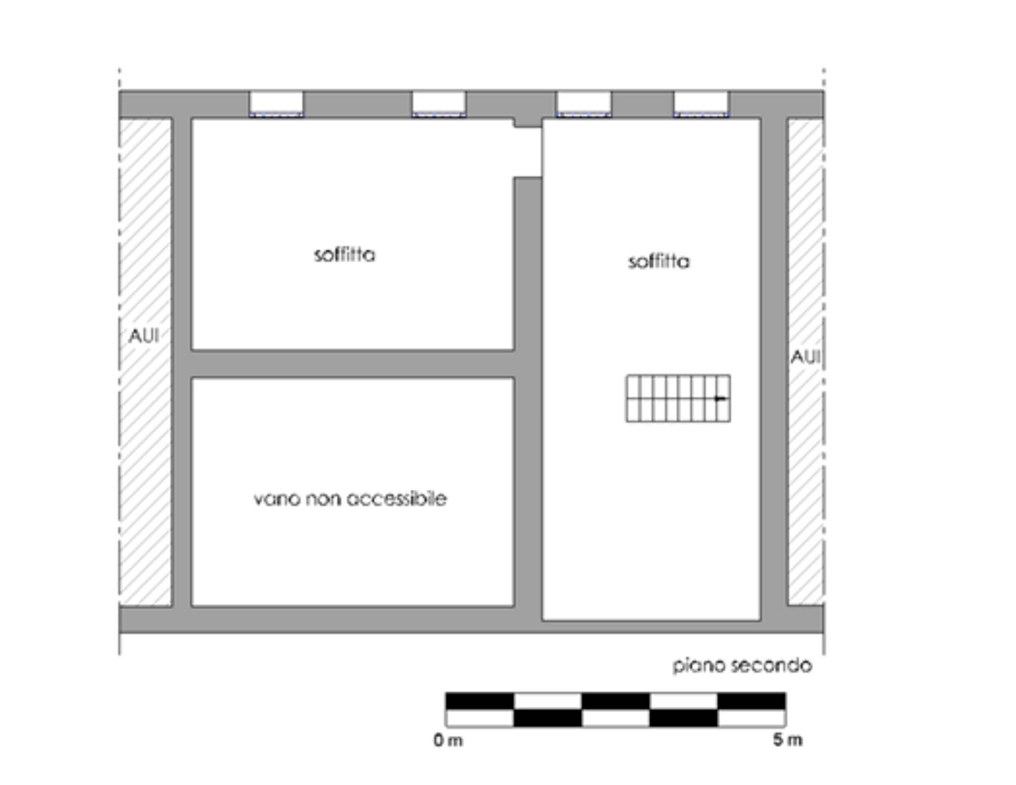 Descrizione sintetica: abitazione su più piani fuori terra. L’accesso all’abitazione avviene direttamente dalla strada comunale; un secondo accesso, sempre pedonale, è possibile attraverso la corte comune. Il piano terra ospita la zona giorno composta da due vani destinati l’uno a soggiorno e l’altro a cucina; da qui, una scala conduce al piano primo che ospita la zona notte composta da due camere singole, una doppia e un bagno; nel disimpegno che divide il bagno dalle camere è presente una scala in legno che conduce alla soffitta, suddivisa in due vani.
