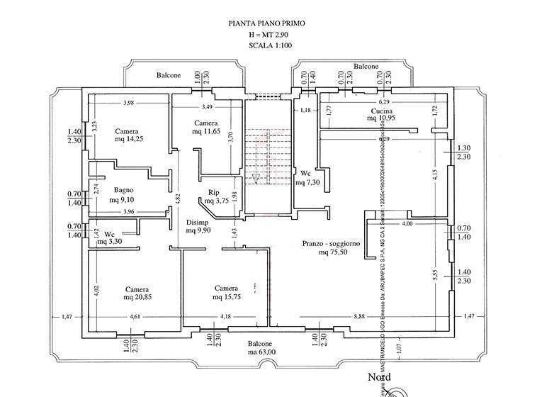 Descrizione sintetica: appartamento al piano primo composta da ampio pranzo-soggiorno, cucina separata, disimpegno, n. 4 camere da letto, un bagno principale, un wc e un ulteriore wc, oltre a ripostiglio di circa 3,75 mq; l’unità è inoltre dotata di tre balconi per complessivi circa 63,00 mq.