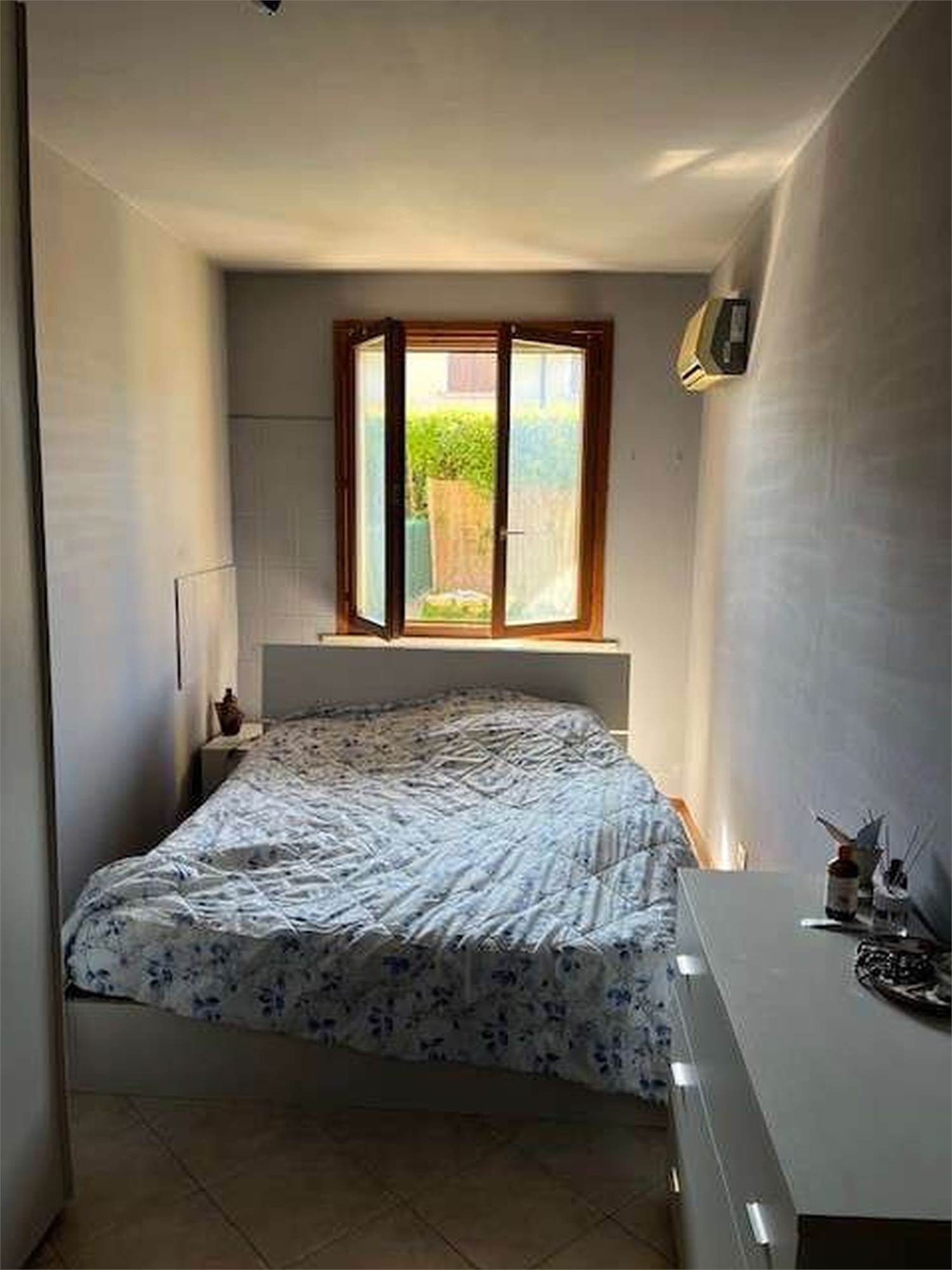 Descrizione sintetica: appartamento di 74 mq disposto tutto al piano terra, di un immobile di due piani fuori terra, con area giardino di 72 mq sul retro e posto auto privato posto davanti all'abitazione. L'appartamento è composto da un portico aperto sul cortile antistante di ingresso di 7,50 mq, da un locale di ingresso di 8,00 mq, da disimpegno di 5,00 mq con ingresso nel locale soggiorno-cucina di 20,00 mq circa, con affaccio sul giardino posto sul retro. Dal disimpegno si accede ad una camera da letto di 14,00 mq circa, ad un piccolo bagno di 2,50 mq, ad un ripostiglio di 1,00 mq circa, e da un locale bagno di 5,60 mq circa.