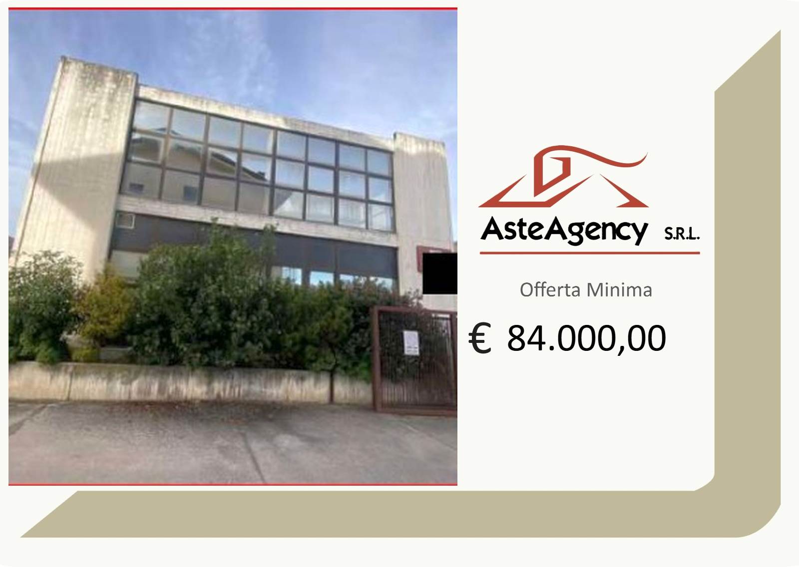 LOTTO UNICO: Piena proprietà per la quota di 1/1 su palazzina con tre unità direzionali. Trattasi di palazzina su due piani fuori terra ed ampio spazio utilizzato come parcheggio privato , oltre a corte comune a tutte le unità con accesso carraio/pedonale. Nello specifico:- ufficio 1: posto al piano terra e composto da ampio spazio per il pubblico, tre uffici suddivisi prevalentemente da armadiature modulari, due servizi e locali accessori.;-ufficio 2:posto al piano primo e composto da ingresso/reception, w.c. e centrale termica, ripostiglio e disimpegno su 5 vani.-ufficio 3: posto al piano primo e composta da ingresso/reception, ampio ufficio open space, ufficio e w.c.