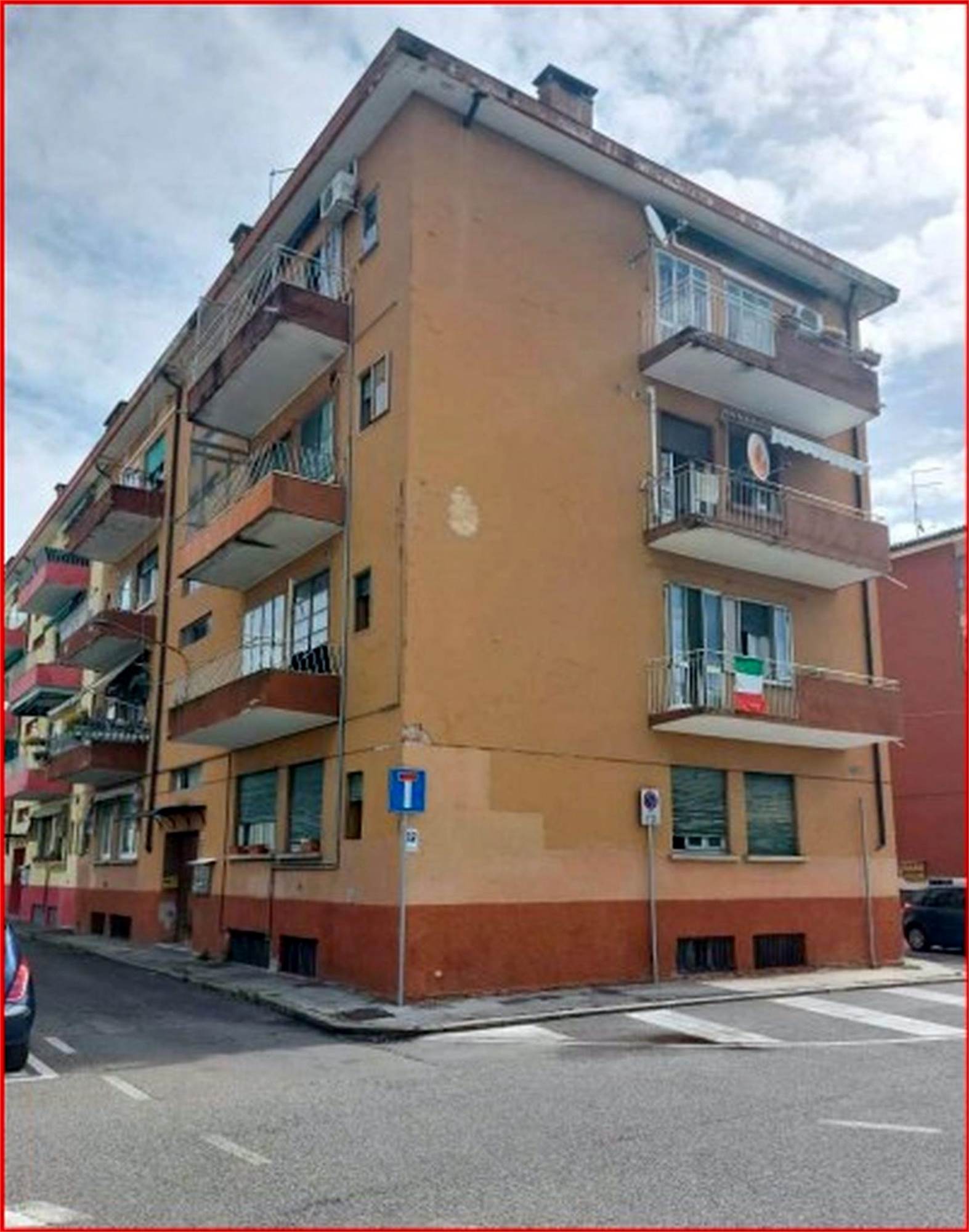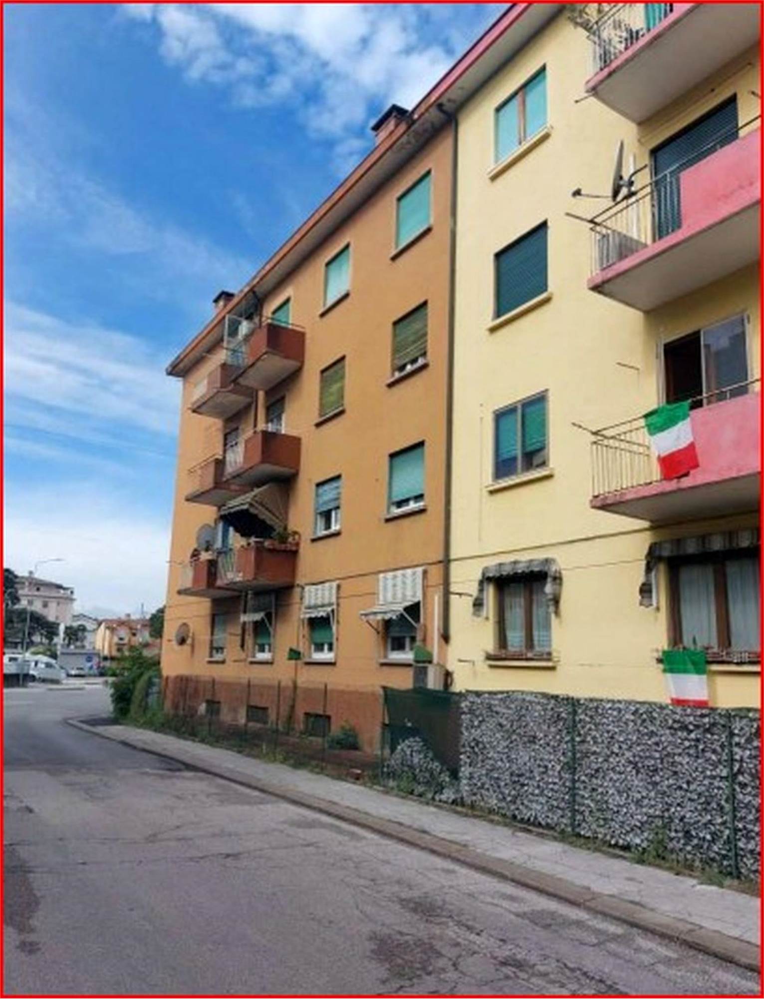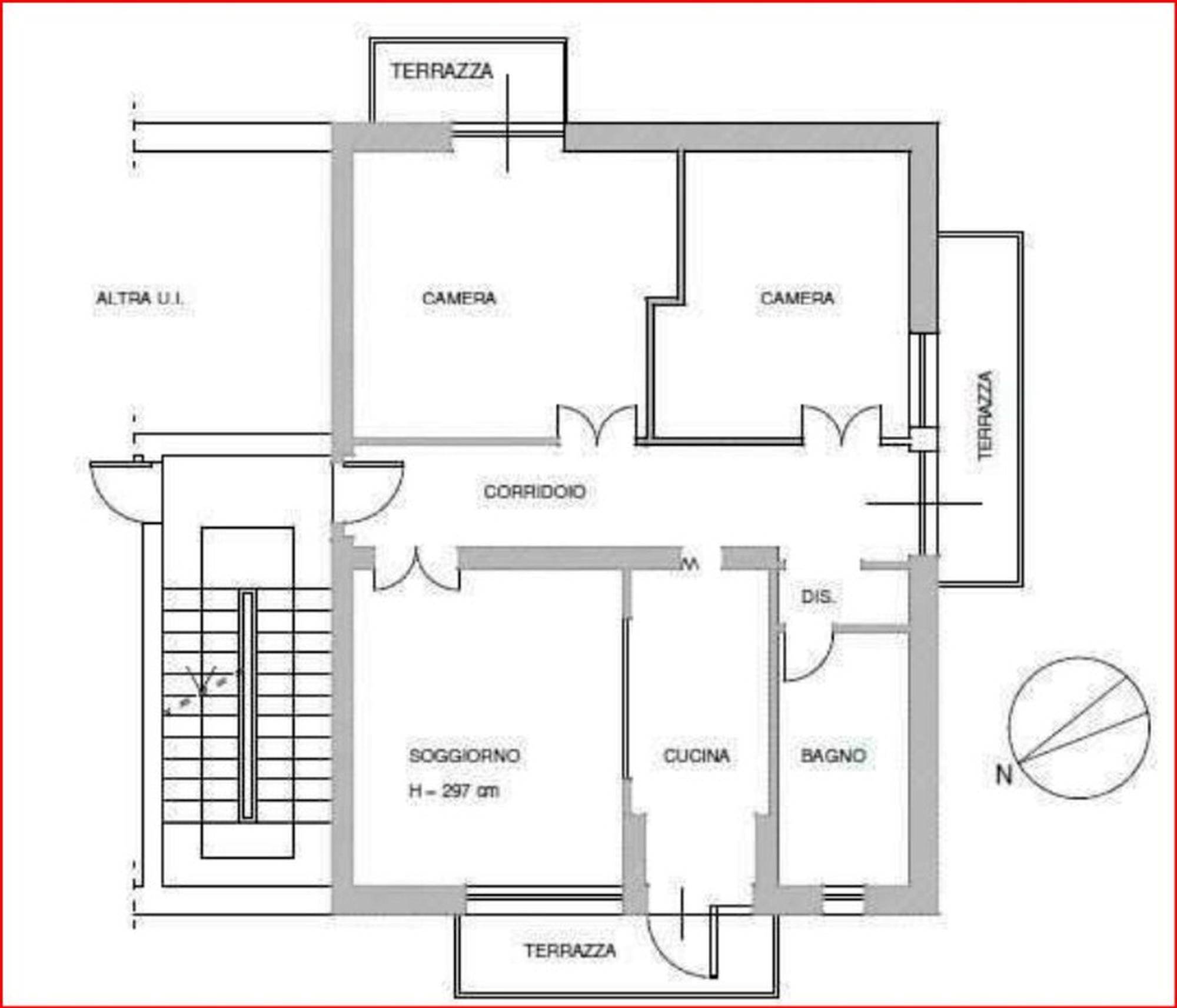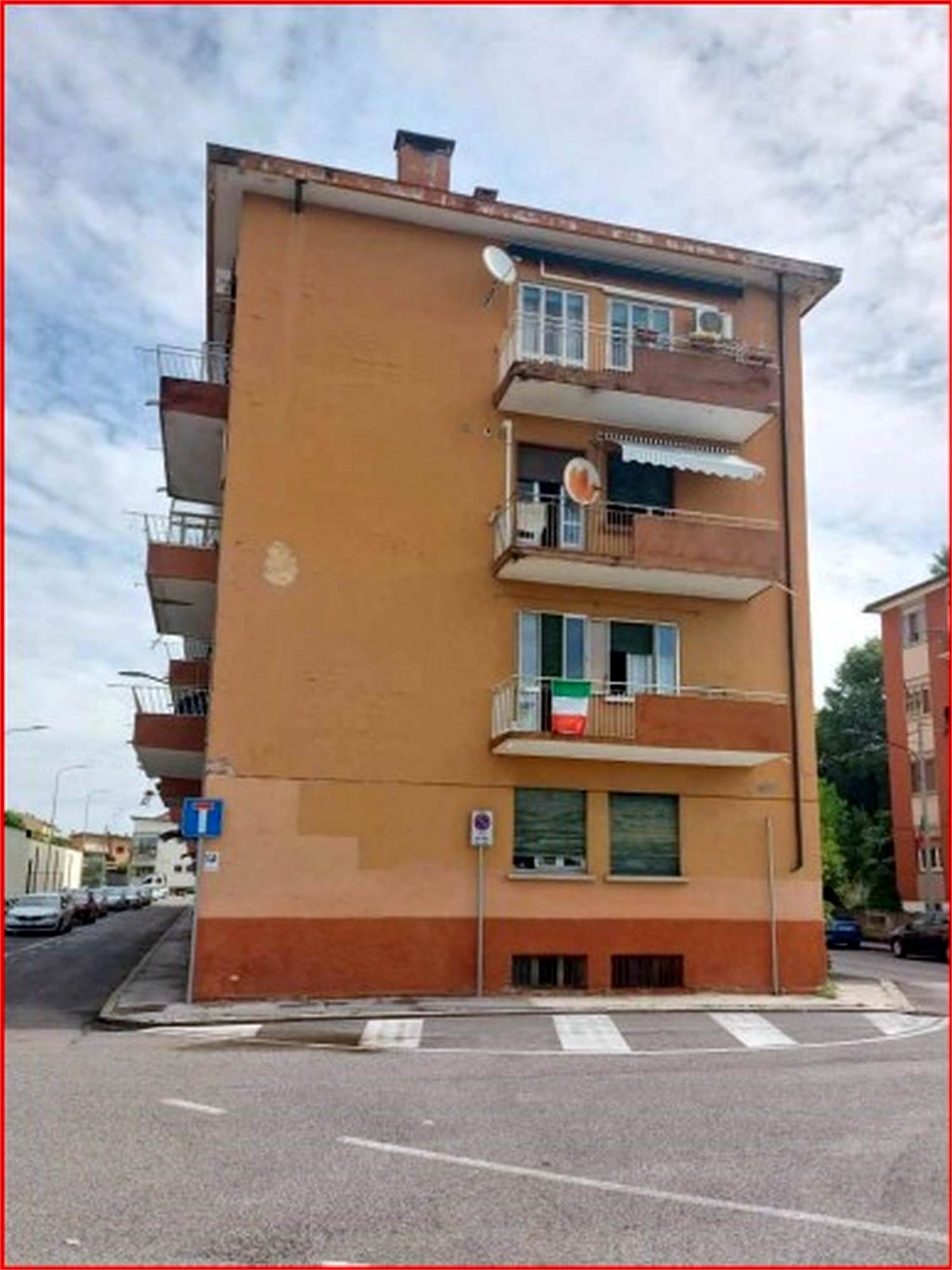 Trattasi di appartamento posto al piano secondo, raggiungibile da vano scala condominiale, privo di ascensore, costituito da soggiorno, cucina separata di modesta larghezza, bagno con antibagno, due ampie camere, corridoio di ingresso-distribuzione e tre terrazze, raggiungibili rispettivamente dal soggiorno, dal corridoio e da una delle due camere. Al piano seminterrato si trova una cantina di circa mq. 14,00.