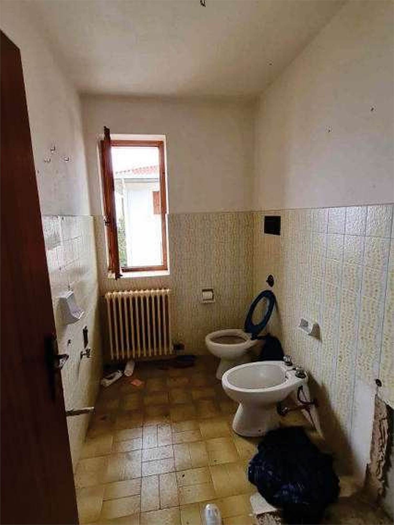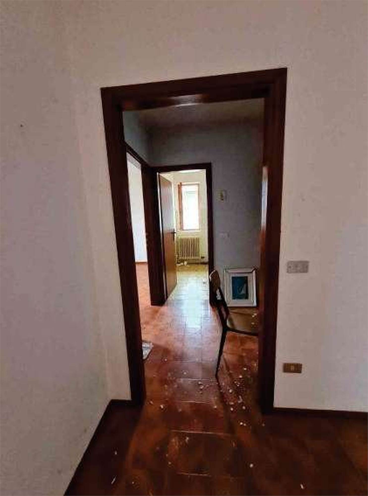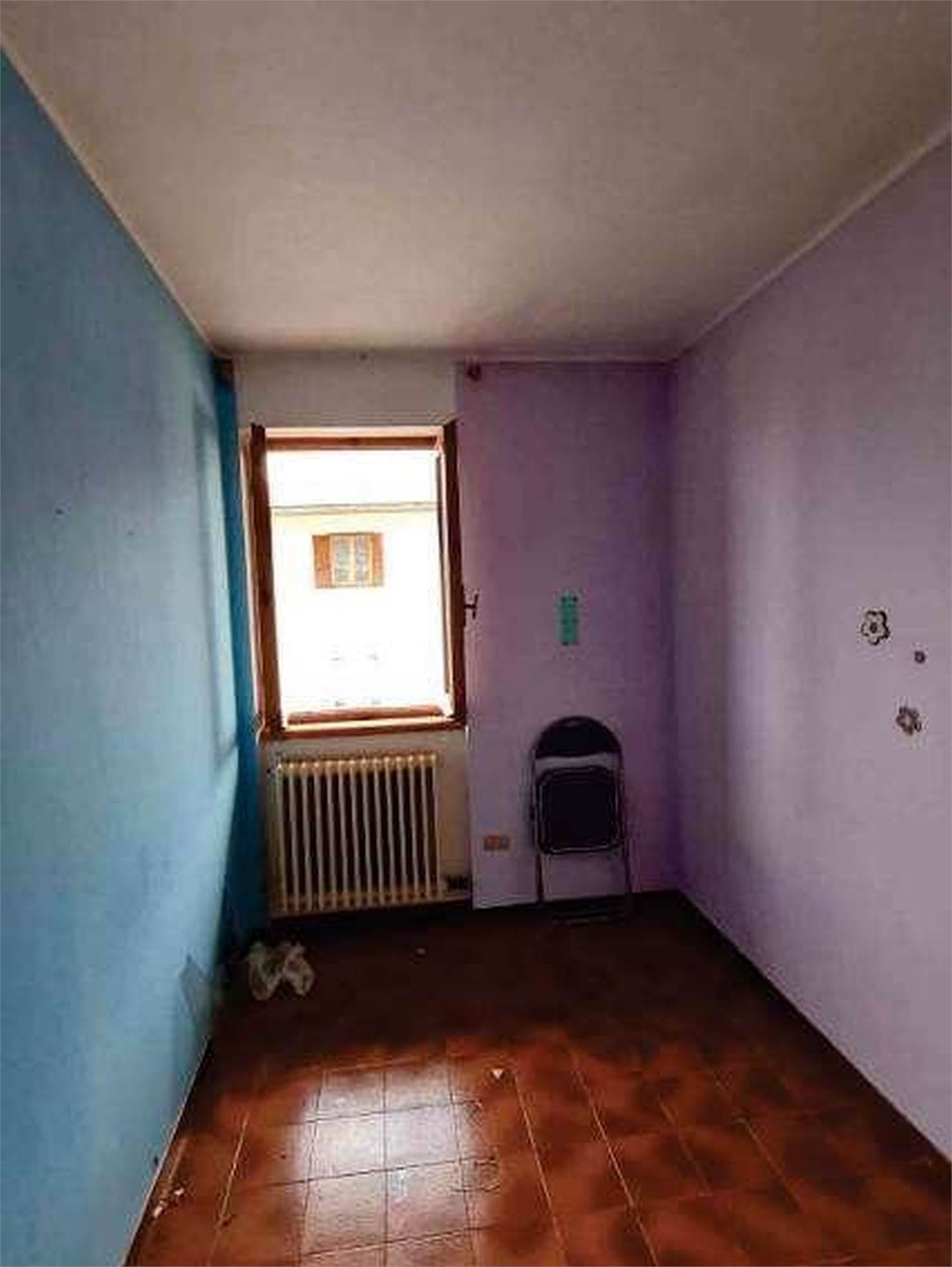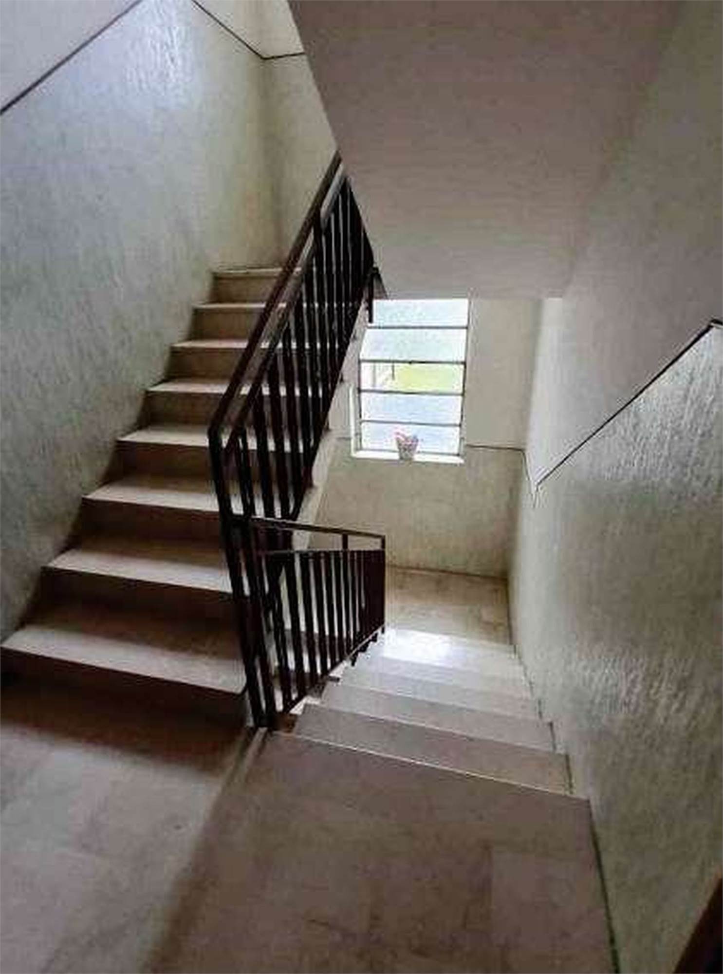 Descrizione sintetica: Appartamento di 68 mq posto al terzo piano con box di 13 mq al piano terra. È composto da ingresso-soggiorno, cucina, disimpegno, due camere, bagno, un balcone e il solaio del sottotetto. Per il riscaldamento si segnala solo la presenza di caloriferi, in parte a moduli in ghisa verniciati e in parte in corpi radianti in alluminio, distribuiti nei vari locali, con la mancanza della caldaia murale a gas metano di tipo autonomo e/o il boiler per la produzione di acqua calda sanitaria.