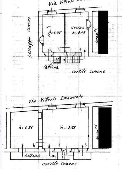 Descrizione sintetica: Appartamento su tre livelli in corte comune, così composto: a piano terra soggiorno/pranzo e cucina; scala di accesso a piano primo e bagno, due camere e balcone, a piano interrato ripostiglio/cantina al rustico. Il piano sottotetto al rustico adibito a soffitta risulta accessibile esclusivamente a mezzo di scala movibile.
