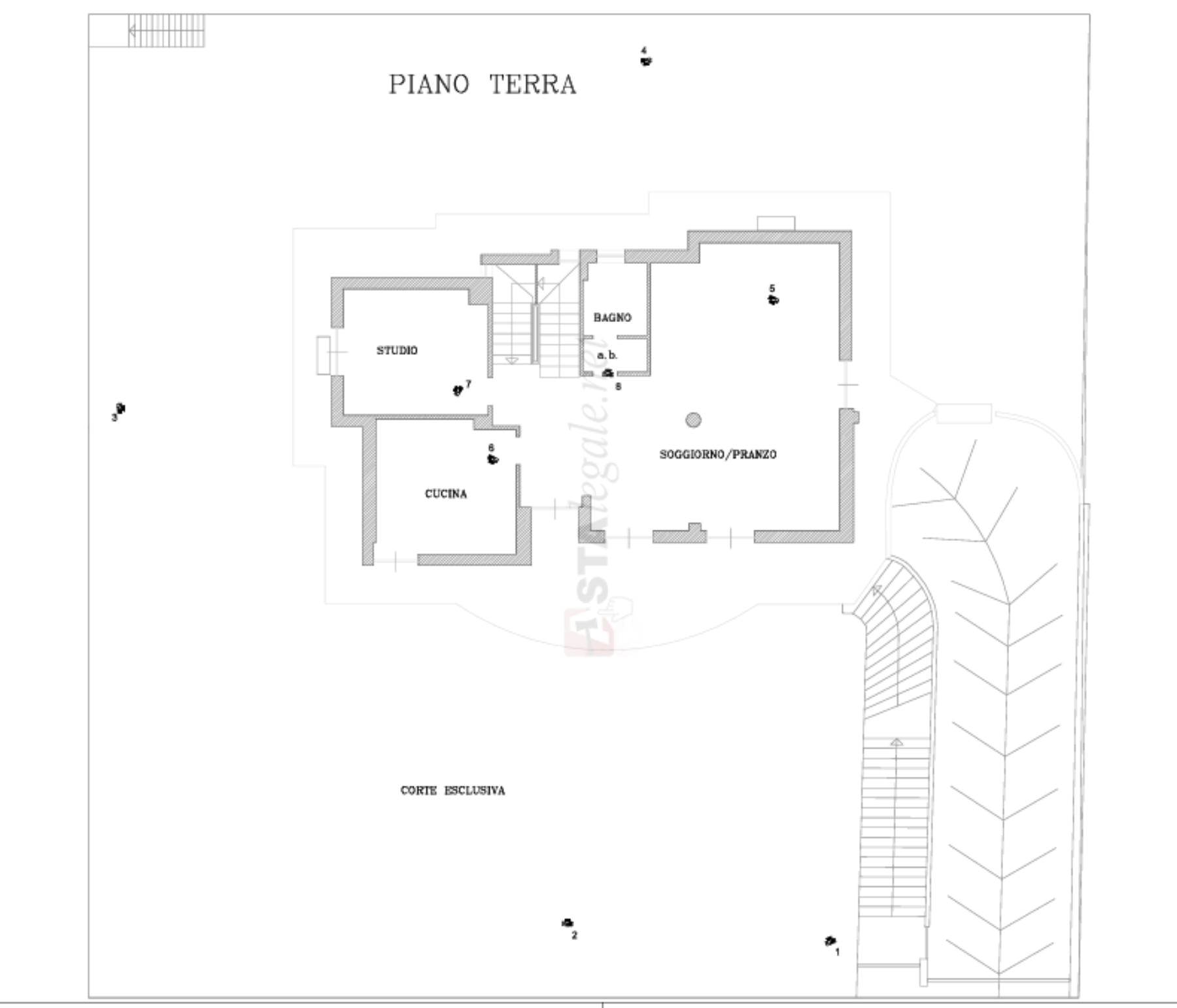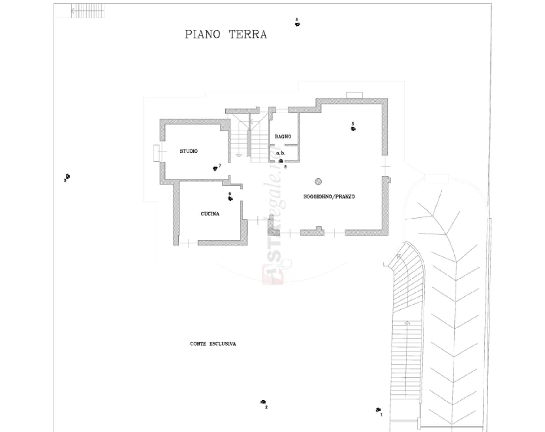 Descrizione sintetica: Villa con annessa corte esclusiva e garage al piano interrato. L’immobile è composto da soggiorno-pranzo, cucina, studio e bagno al piano terra; quattro camere da letto, un bagno e un wc, uno studio al piano primo; un ripostiglio e uno stenditoio al piano secondo sottotetto, lasciato grezzo; un locale autorimessa al piano interrato.